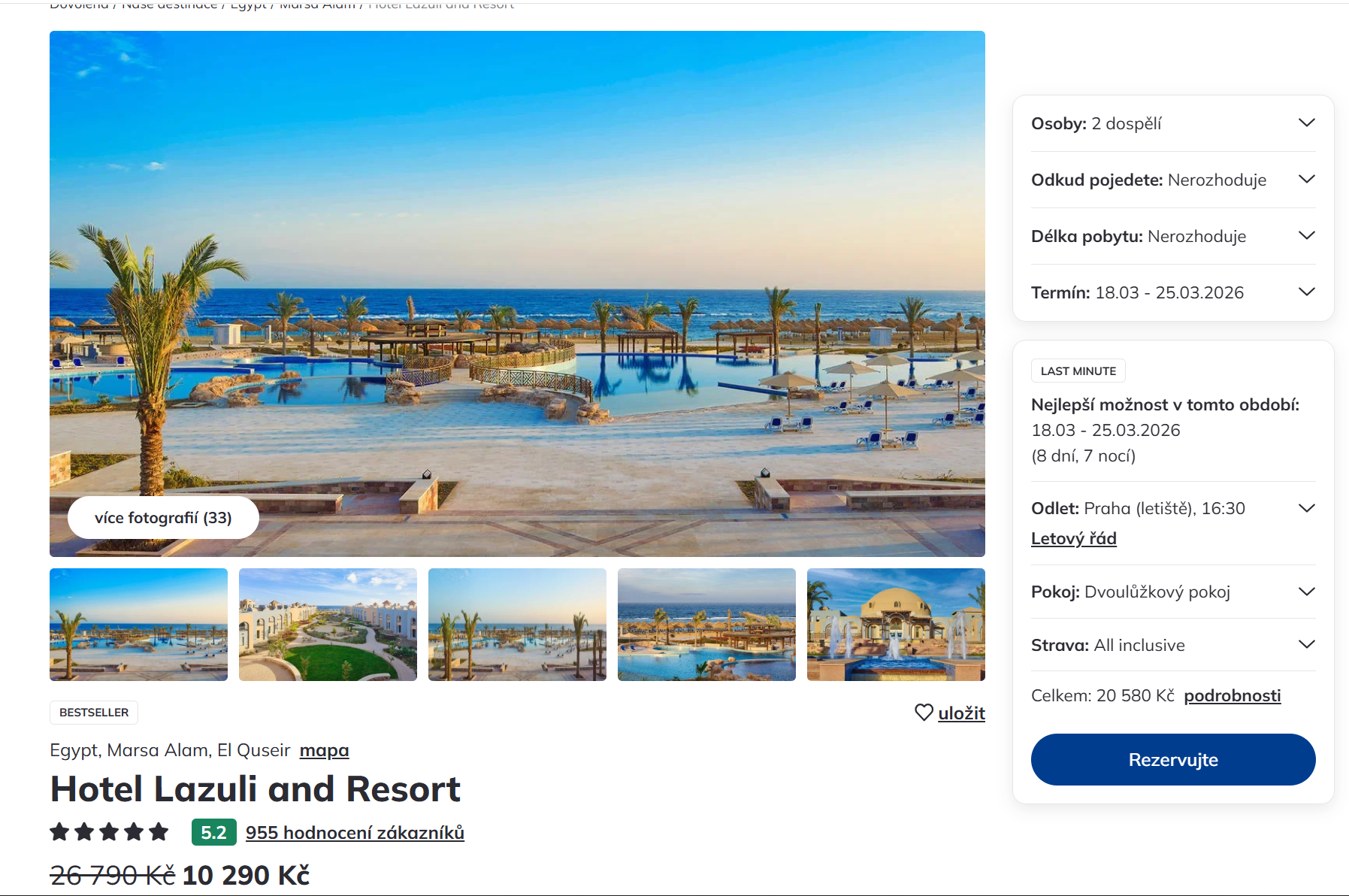 Vydejte se za týden na dovolenou z Prahy do Egypta. Velmi dobře hodnocený a oblíbený 4-hvězdičkový hotel je umístěn v letovisku Marsa Alam. Dovolená na 8 dní (7 nocí) s odletem z Prahy a s all inclusive vás vyjde na 10 290 Kč. Zájezd je v termínu od 18.  - 25.3.2026. Zájezd