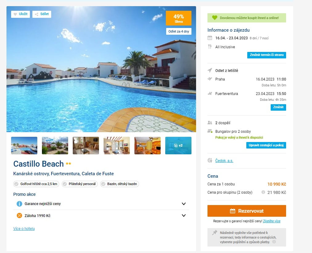 Vydejte se tuto neděli na dovolenou na Kanáry, konkrétně na Fuerteventuru. Dobře hodnocený 2-hvězdičkový hotel je umístěn v Caleta de Fuste. Dovolená na 8 dní (7 nocí) s all-inclusive a odletem z Prahy Vás vyjde na 10 990 Kč. Zájezd je v termínu od 16. - 23.4. 2023. Zájezd