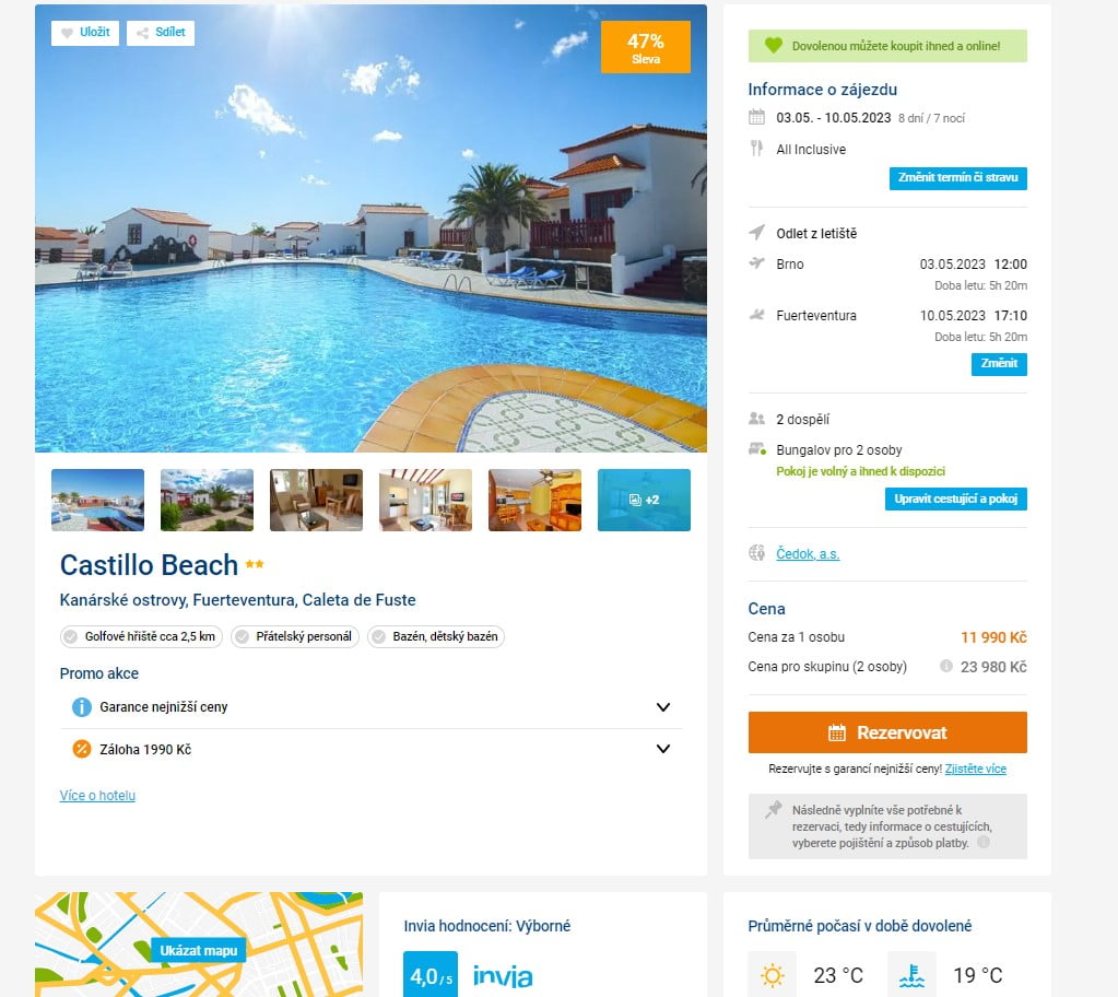 Vydejte se příští středu na dovolenou na Kanáry, konkrétně na Fuerteventuru. Dobře hodnocený 2-hvězdičkový hotel je umístěn v Caleta de Fuste. Dovolená na 8 dní (7 nocí) s all-inclusive a odletem z Brna Vás vyjde na 11 990 Kč. Zájezd je v termínu od 3. - 10.5. 2023. Zájezd