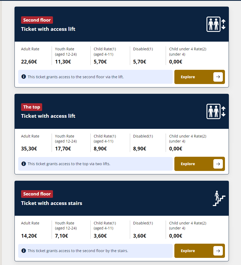 Děti ve věku 4-11 let: mají nárok na sníženou cenu. Například cena vstupenky výtahem na 2. patro se pohybuje kolem 5,70 EUR, zatímco na vrchol věže 8,90 EUR.