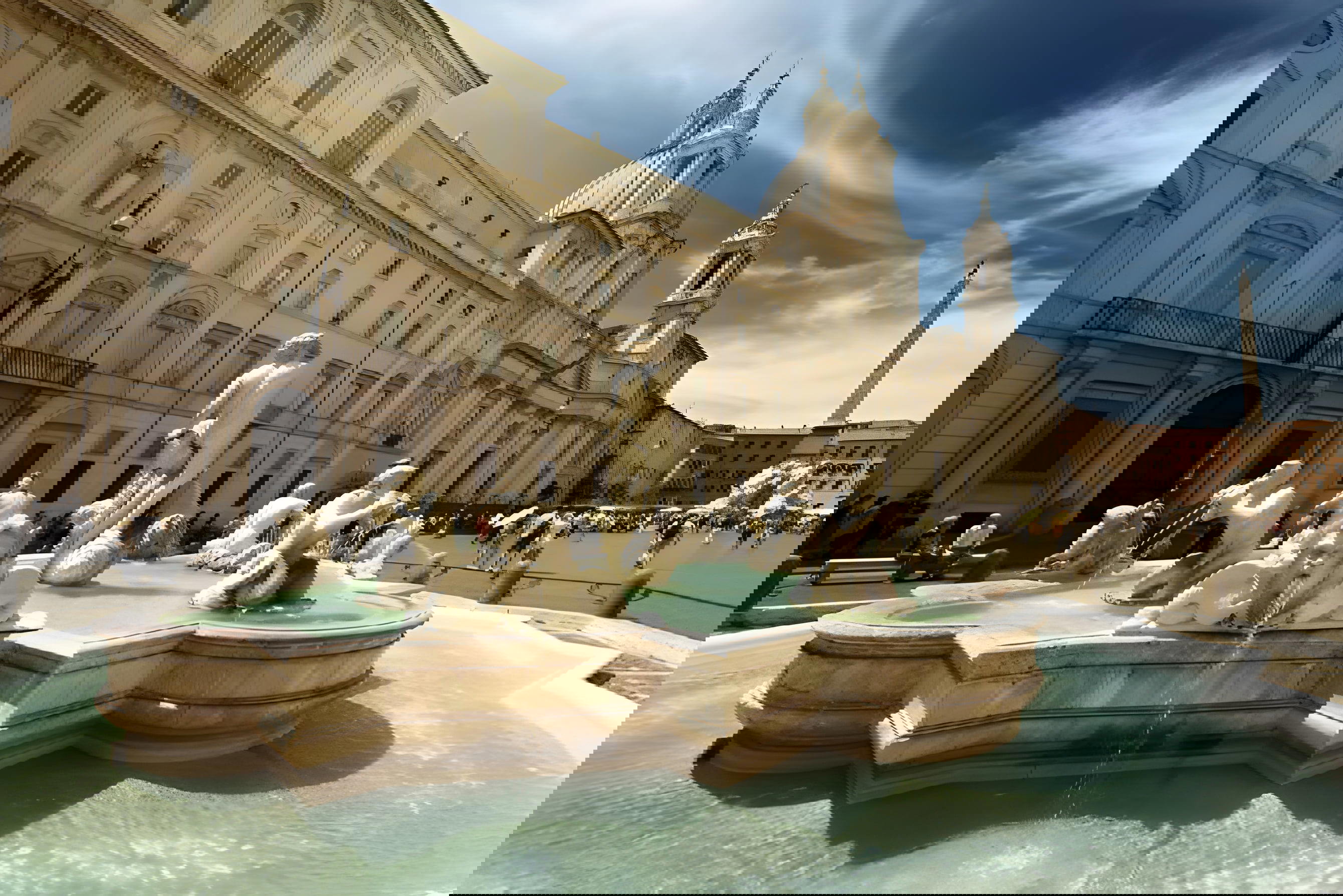 Nejslavnější barokní římské náměstí Piazza Navona se nachází na místě původního Domiciánova stadionu z roku 79 př. n. l., kde se odehrávaly atletické hry. Dnes se na náměstí konají nejrůznější představení. Náměstí Piazza Navona je známé především díky Fontáně Čtyř řek (Fontana dei Fuimi) od Berniniho, dále se zde nachází menší fontána – Neptunova kašna (Fontana del Nettuno) a Maurova fontána (Fontana del Moro). Ve večerních hodinách náměstí ožívá klasickým italským nočním životem.