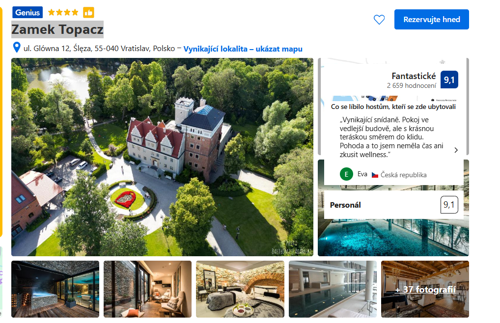 Vybavení: Zamek Topacz nabízí pokoje a apartmány, které jsou luxusně zařízené s důrazem na historické detaily. Hosté si mohou užít krásně upravený areál, včetně jezírka, a různé outdoorové aktivity (jízda na kole). Zámek disponuje moderním wellness centrem, které zahrnuje vířivku, sauny, a nabídku relaxačních masáží, ideální pro odpočinek po dni stráveném prozkoumáváním okolí.