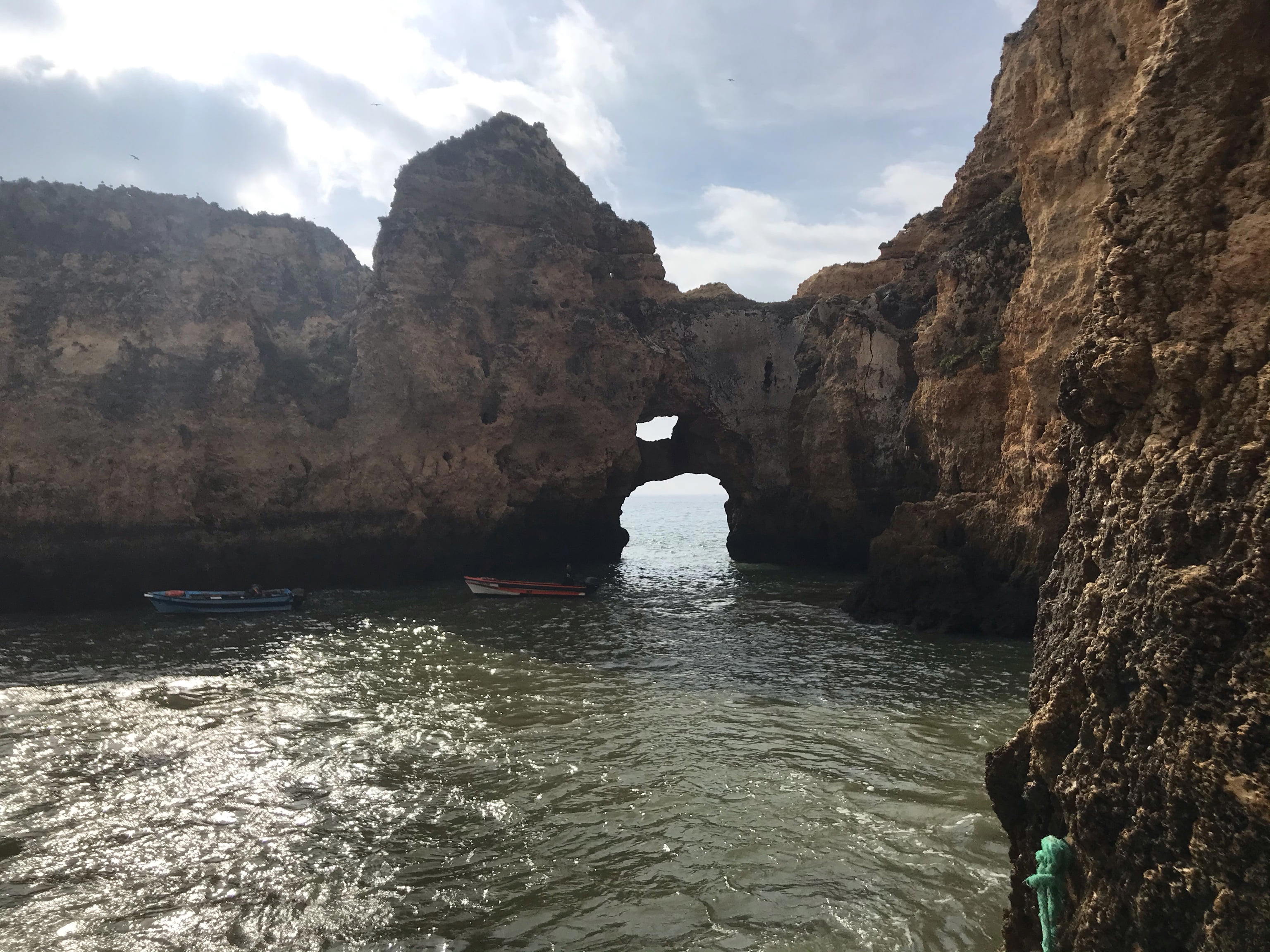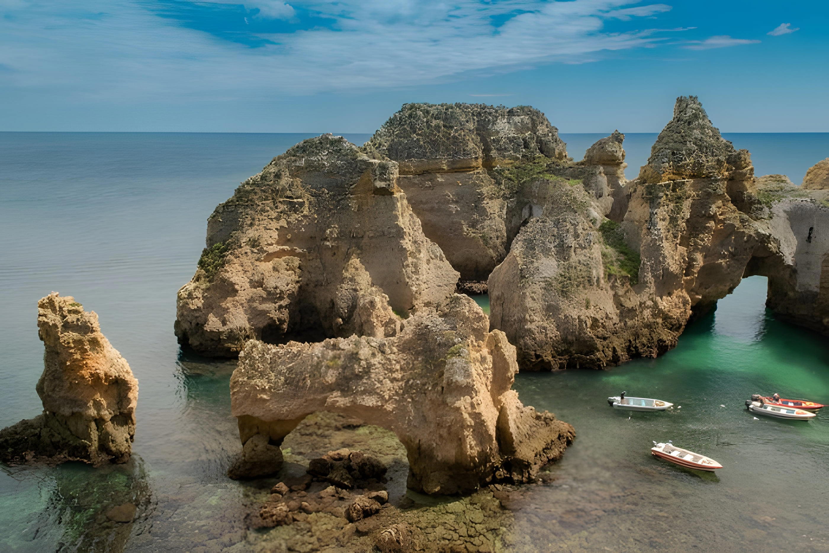 Skalní útesy podél pobřezí blízko města Lagos. Uskupení skalních útvarů spolu s malými plážemi je považováno za nejkrásnější a nejnavštěvovanější místo v Portugalsku.