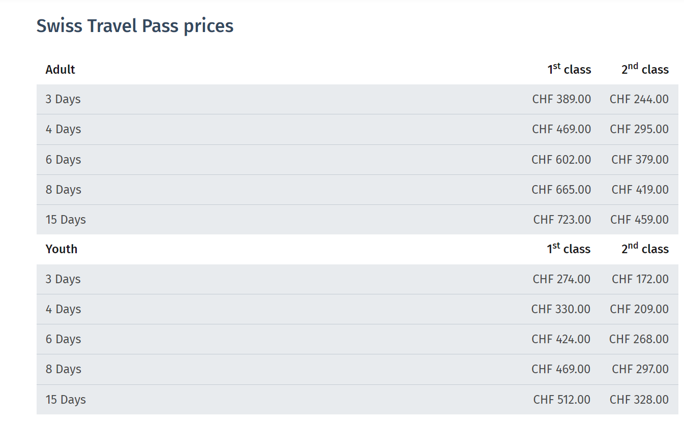 Ceny se liší podle délky platnosti. Například třídenní pass začíná kolem 244 CHF pro dospělého, zatímco 15denní pass stojí přibližně 512 CHF. Swiss Travel Pass je také k dispozici ve 1. a 2. třídě, což ovlivňuje cenu.